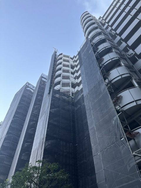 足場工事とは、建物の外壁や屋根などに設置する仮設構造物のことで、改修足場・新築足場・解体足場などの種類があります。